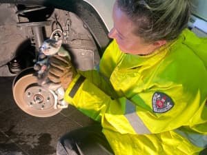 Firefighters from Bankstown Fire Station worked quickly to remove the tyre of the car so they could access the feline who had jumped up into the engine of the SUV.