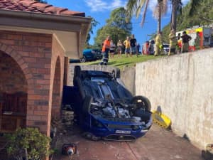 Firefighters from Gosford Fire Station arrived on scene to find the car has slid down an embankment and flipped, landing in the driveway of a home and trapping the driver.